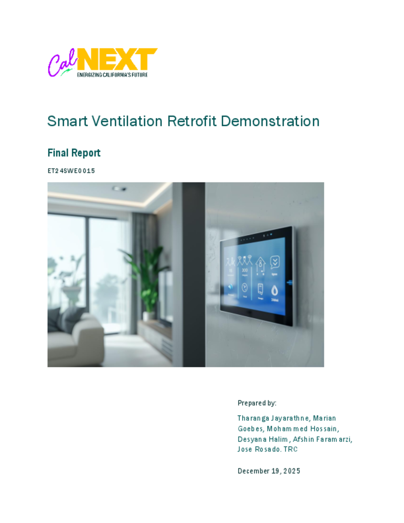 As residential construction moves toward tighter building envelopes to enhance energy efficiency, maintaining indoor air quality (IAQ) has become a critical challenge. California’s Title 24 Building Energy Efficiency Standards mandate continuous or scheduled outdoor air (OA) ventilation in residential new construction but does not provide a path to dynamically vary ventilation based on pollutant levels. This project explored the potential of smart ventilation systems that activate ventilation based on real-time IAQ measurements, aiming to improve energy efficiency while maintaining acceptable IAQ.