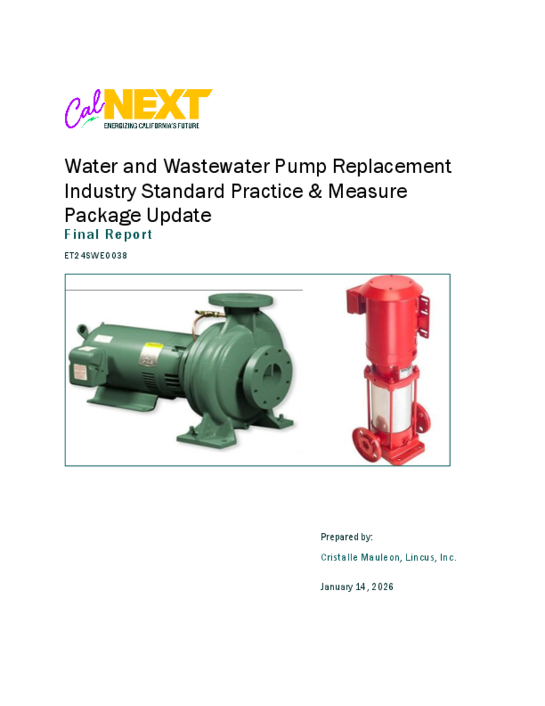This project will perform a Market-Based ISP Study for clean water pumps and will update the existing MP SWWHP004-03 with the appropriate industry-standard PEI. This project will create a new MP for wastewater pumps or modify the existing MP to include wastewater pumps leveraging the previous CalNEXT study.