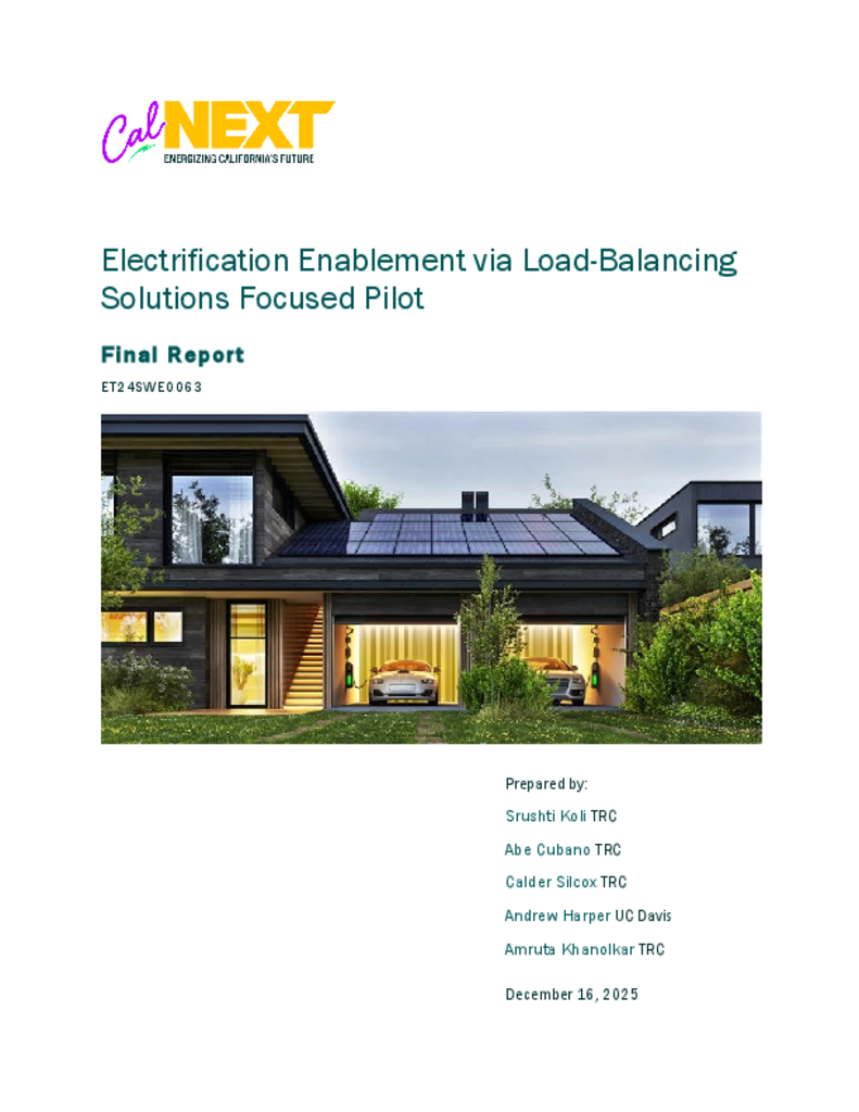 The CalNEXT Electrification Enablement via Load-Balancing Solutions Focused Pilot was launched in early 2025. Its primary objective was to understand how load-balancing solutions or technologies were being used in existing electric vehicle supply equipment installations and validate load-balancing technologies’ potential to enable additional electrification without requiring costly electrical panel or service upsizing. The Electric Power Research Institute estimates that more than 50 percent homes have two or fewer open breaker slots in their existing electrical panel, resulting in the need for electrical modifications like adding subpanels to accommodate the new electrified loads. This pilot contains findings and recommendations to address barriers to integrating load-balancing technologies into electrification projects, including ways that contractors, customers, and program implementers can use load-balancing technologies to avoid a service upsizing.