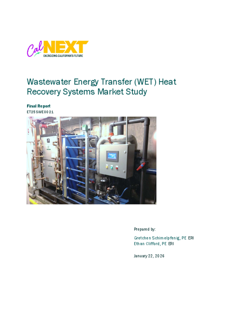 The Wastewater Energy Transfer (WET) Market Study CalNEXT project explored WET market potential in California investor-owned utility territory and assessed how WET can reduce the barriers to energy efficiency and electrification. The project aimed to achieve this by decreasing energy consumption and demand, decreasing operating costs, and increasing building energy resiliency across nonresidential (commercial, industrial, and agricultural) customer segments. This project assessed WET technologies and their relevance to the California nonresidential buildings market to better understand the landscape and program impacts and how to scale the market for nonresidential WET systems.